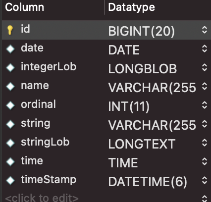 Mysql에서의 결과를 보면 stringLob은 LONGTEXT, integerLob은 LONGBLOB으로 매핑된 것을 확인할 수 있다.