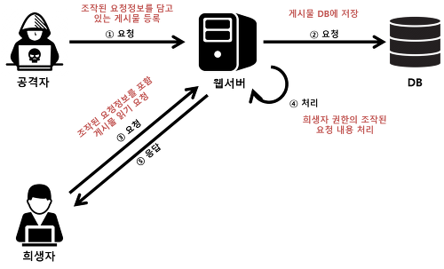 보통 웹사이트 게시글에 악의적인 스크립트를 넣어 유저가 게시글에 들어가게끔 유도하게 하여 공격한다.